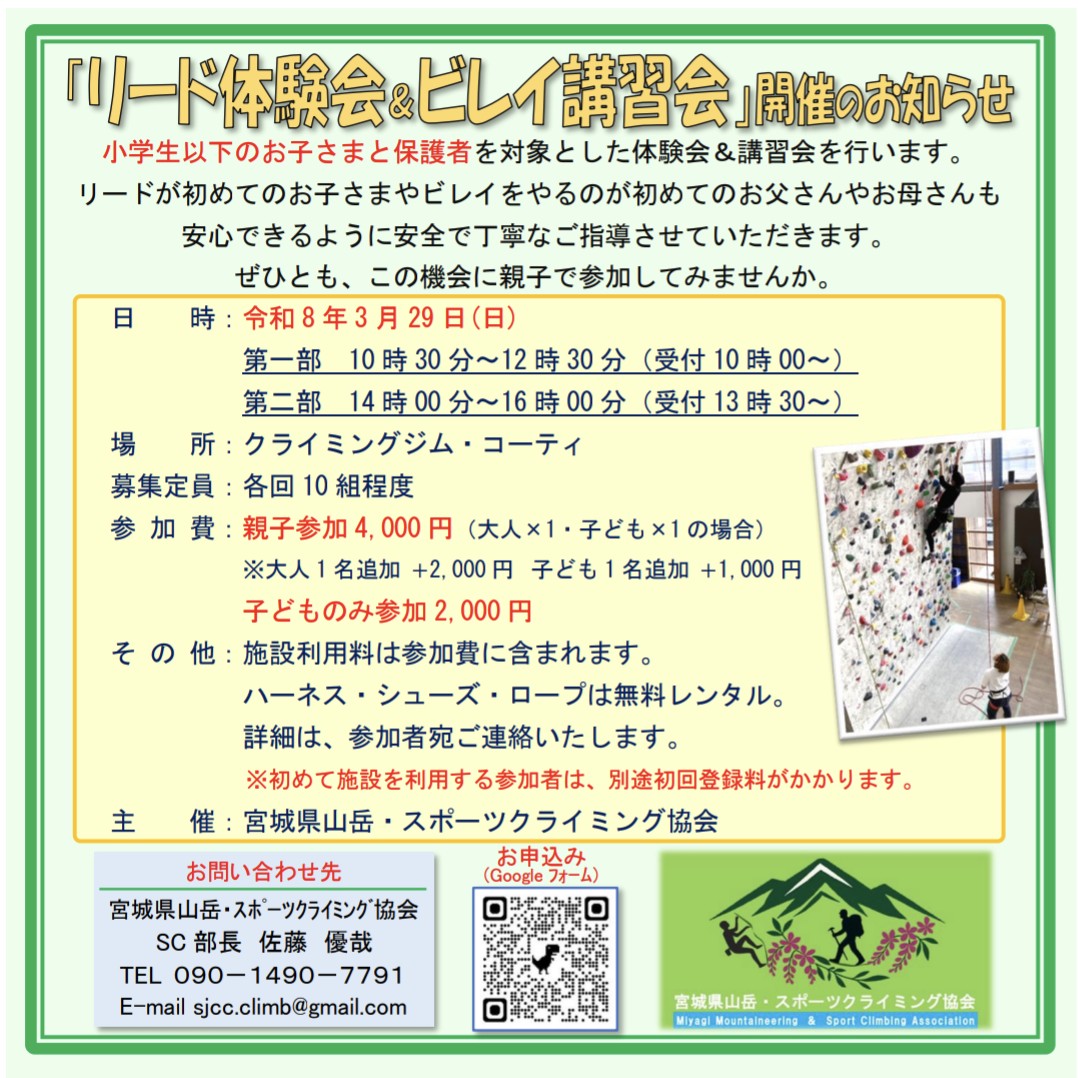 リード体験会&ビレイ講習会 開催のお知らせ